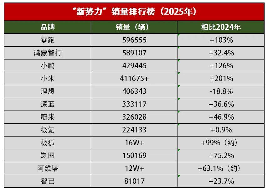 2025年已正式收官,“新势力”的格局又一次洗牌,全年最新销量排行如下:
